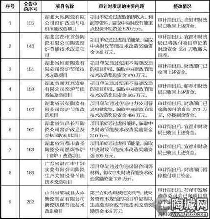 “三款科目資金”審計(jì)結(jié)果顯示,云南省曲靖市石林錦達(dá)瓷業(yè)有限公司、湖北省宜昌長江陶瓷公司、湖北宜都市首佳陶瓷有限公司、湖北大地陶瓷有限公司、湖北省興榮陶瓷有限公司、湖北省恒新陶瓷有限公司、湖北省鄂州中冠陶瓷有限公司、湖北陶星陶瓷科技有限公司、湖北省宜都市鑫圣陶瓷公司、湖北省新萬興瓷業(yè)有限公司、廣東省湛江市中冠實(shí)業(yè)有限公司、廣東潮州時尚衛(wèi)浴實(shí)業(yè)有限公司以及山東省鄆城縣大眾搪瓷制品有限公司等14家國內(nèi)陶瓷衛(wèi)浴產(chǎn)業(yè)機(jī)構(gòu),利用窯爐、噴霧塔、電機(jī)設(shè)備以及余熱(尾氣)回收利用等節(jié)能改造項(xiàng)目,共騙取中央獎勵資金高達(dá)7392.83萬元,約占報告總體涉案金額的4.6%,現(xiàn)已收回違規(guī)資金3631萬元,回收率尚不足50%。