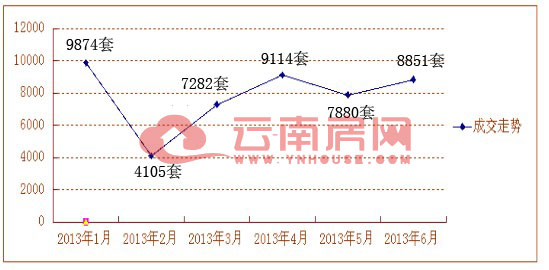 2013年上半年,昆明樓市成交商品房47106套,成交總面積為4169255.8㎡,成交面積、成交套數(shù)均較2012年上半年數(shù)據(jù)有較大幅度增長。2013年1月,昆明樓市成交商品房9874套,為2013年上半年最高值,2013年2月,由于正值農(nóng)歷春節(jié),4105套的月度成交數(shù)據(jù)也算差強人意。進入三月,昆明樓市成交重回正常水平,月度成交商品房7282套,4月、5月、6月成交套數(shù)則分別為9114套、7880套、8851套,成交數(shù)據(jù)基本維持在高位。通過計算可以得知,2013年上半年,昆明樓市月度成交商品房平均值為7851套,比2012年上半年月度成交平均值5699套多出2162套;