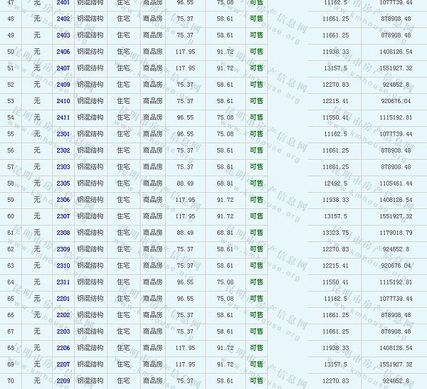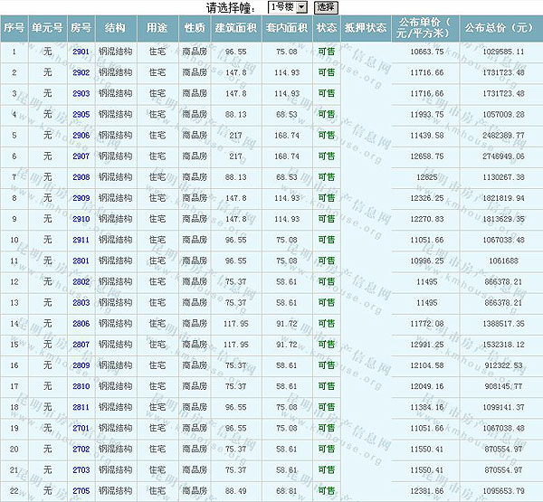 根據(jù)云南省物價局關于發(fā)布《云南省商品房銷售明碼標價實施細則(試行)》的通知,現(xiàn)將該項目商品住房的準售房源及每套房屋價格向社會公布,房地產(chǎn)開發(fā)企業(yè)應嚴格按照公布價格,商品房銷售明碼標價實行一套一標。商品房經(jīng)營者應當對每套商品房按照建筑面具進行明碼標價,否則,房產(chǎn)登記機關不予登記備案。準售房源及房價信息如下: