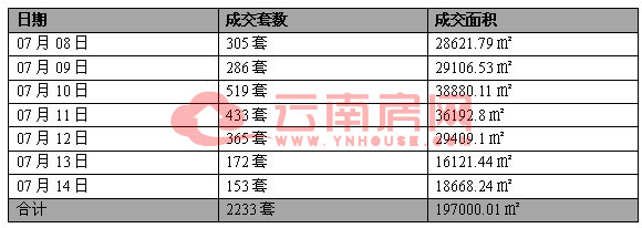 成交數(shù)據(jù)方面,根據(jù)昆明市房產(chǎn)信息網(wǎng)統(tǒng)計(jì)數(shù)據(jù)顯示,從2013年07月08日至2013年07月14日,一周內(nèi)昆明主城區(qū)及呈貢新城共成交各類商品房2233套,較前一周2317套減少了84套,環(huán)比下跌了3.63%;成交面積方面,上周昆明樓市成交商品房總面積為197000.01㎡,較前一周213839.81㎡減少了16839.8㎡,環(huán)比下跌了7.87%。