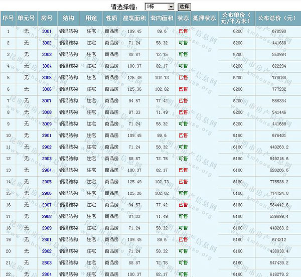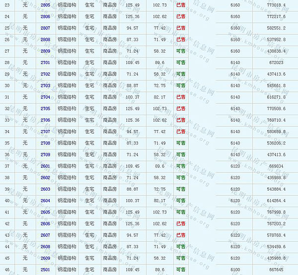 根據(jù)云南省物價局關(guān)于發(fā)布《云南省商品房銷售明碼標價實施細則(試行)》的通知,現(xiàn)將該項目商品住房的準售房源及每套房屋價格向社會公布,房地產(chǎn)開發(fā)企業(yè)應(yīng)嚴格按照公布價格,商品房銷售明碼標價實行一套一標。商品房經(jīng)營者應(yīng)當(dāng)對每套商品房按照建筑面具進行明碼標價,否則,房產(chǎn)登記機關(guān)不予登記備案。準售房源及房價信息如下:
