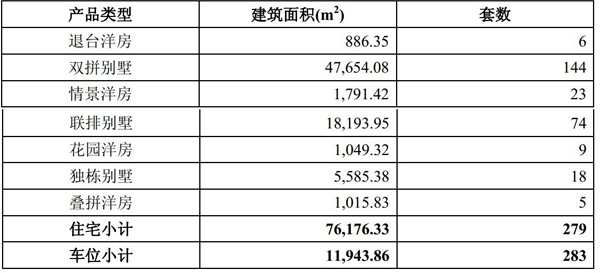 頤明園項目分為兩期工程進行開發(fā)建設(shè)。項目一期工程,主要為職工配套住宅用住宅,用地面積約為567.013畝,建筑面積310,525.85m2,分為春花里、夏溪里、秋實里、冬青里四個區(qū)域,包括住宅1,638套,可分為退臺洋房、雙拼別墅、情景洋房、聯(lián)排別墅、花園洋房、獨棟別墅、疊拼洋房等7種產(chǎn)品類型;車位1,112個;配套用房66套;幼兒園1所。截止至評估基準(zhǔn)日一期項目已建成完工,未竣工結(jié)算,已售住宅1359套,已售停車位829個,未售完的住宅279套,未售完的停車位283個,未售完的存量資源的情況如下表: