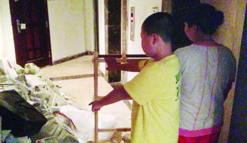 據(jù)住戶劉女士介紹,她家住在睿力上城3棟1單元20樓,大約在6月中旬,開始有住戶往電梯口附近傾倒裝修垃圾,從一家發(fā)展到兩家、三家,裝修垃圾漸漸堆積成一座小山。不僅有破碎的磚塊、木料、廢棄的水泥、砂石,還有很多尖銳的木柴,鐵釘?shù)取S捎诿繎糇舳际孪劝次锕艿囊罄U納了近600元的裝修垃圾清運費,于是這些傾倒垃圾的住戶紛紛撥打物管電話,請他們及時安排人員前來清運?墒,每次物管接線員都回答:“馬上安排”,卻遲遲不見任何動靜,就這樣,7月初,其中一道電梯門被垃圾完全堵住,住戶們無奈之下,只好自己動手將這些堆積在電梯口的垃圾“平均分配”到整個樓道的長廊,這才勉強可以進出電梯。