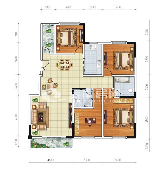 Y-B戶型,總建筑面積約142.21平米,四室兩廳一廚兩衛(wèi)兩陽臺設計