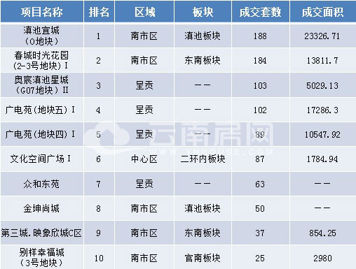 本周備案前三強分別位于南市區(qū)與呈貢,排名先后順序為:滇池宜城(O地塊)、春城時光花(2-3號地塊)Ⅰ和奧宸滇池星城(G07地塊)Ⅱ。注:由于備案系統(tǒng)公布數(shù)據(jù)局限,top10排名僅做參考。