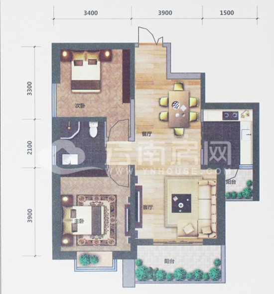 格局:2室2廳1廚1衛(wèi)2陽(yáng)臺(tái)