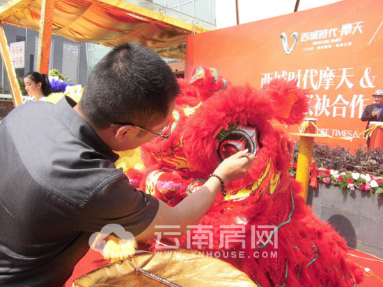 之后威風(fēng)的小獅子要上臺(tái)表演,由建發(fā)羅副總和英致遠(yuǎn)周總等企業(yè)領(lǐng)導(dǎo)幫獅子點(diǎn)上眼睛并合影留念。在越來越緊湊的鼓聲中,禮花灑向天空,建發(fā)領(lǐng)導(dǎo)羅副總、營銷許副總、總工室黃總、成本總監(jiān)楊總、財(cái)務(wù)總監(jiān)葉總和英致遠(yuǎn)周總7位企業(yè)領(lǐng)導(dǎo)人完成剪彩儀式,舞獅踏上高聳的駐臺(tái),掛出“財(cái)源廣進(jìn)”的字樣之后儀式進(jìn)入尾聲。