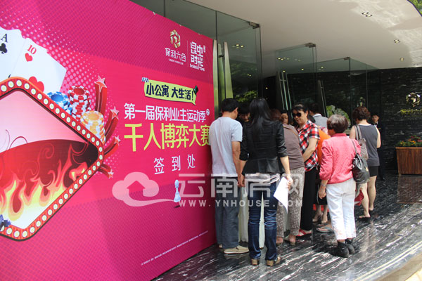 云南房網(wǎng)于下午2點到達保利·六合位于人民西路與近華浦路交叉口(春城花園酒店斜對面)的營銷中心時,門口接受登記并換取參賽證的簽到臺前,已經(jīng)排起了長隊。2:30分不到,云南房網(wǎng)進到斗地主、德州撲克比賽現(xiàn)場觀看時,現(xiàn)場早已座無虛席,如火如荼的比賽已經(jīng)在參賽者的要求下,提前開始了。