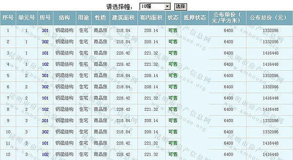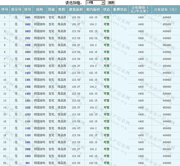 根據(jù)云南省物價(jià)局關(guān)于發(fā)布《云南省商品房銷售明碼標(biāo)價(jià)實(shí)施細(xì)則(試行)》的通知,現(xiàn)將該項(xiàng)目商品住房的準(zhǔn)售房源及每套房屋價(jià)格向社會(huì)公布,房地產(chǎn)開(kāi)發(fā)企業(yè)應(yīng)嚴(yán)格按照公布價(jià)格,商品房銷售明碼標(biāo)價(jià)實(shí)行一套一標(biāo)。商品房經(jīng)營(yíng)者應(yīng)當(dāng)對(duì)每套商品房按照建筑面具進(jìn)行明碼標(biāo)價(jià),否則,房產(chǎn)登記機(jī)關(guān)不予登記備案。準(zhǔn)售房源及房?jī)r(jià)信息如下: