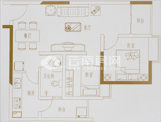 二室二廳一廚一衛(wèi)約,65平米。這個(gè)戶型就小編看來(lái)頗為緊湊,但“麻雀雖小五臟俱全”,客餐廳通廳相連,緊接著觀景露臺(tái),采光較好。封閉式廚房與生活陽(yáng)臺(tái)相連,日常生活干濕分離,頗為方便。作為婚房和年輕人初次置業(yè)都是不錯(cuò)的選擇。