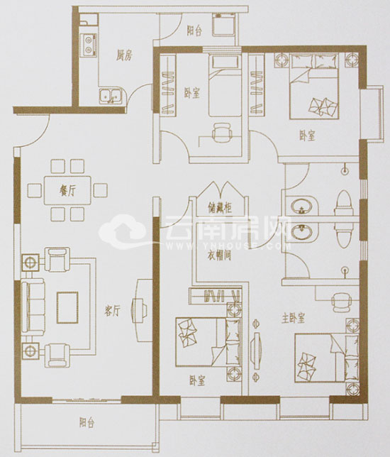 139㎡的四房戶型,可以說是三房的豪華升級版。衣帽間和儲藏柜的規(guī)劃大大方便了主任的日常生活。獨(dú)立封閉式的廚房剛好符合了中餐烹飪的習(xí)慣。休息區(qū)與日常生活區(qū)也完全的分開了,比較能突出屋住的身份。要說美中不足的就是四個臥室相對相連的設(shè)計太過緊湊。除主臥之外其他三室設(shè)計無太多差別。唯有靠個性化裝修來彌補(bǔ)。