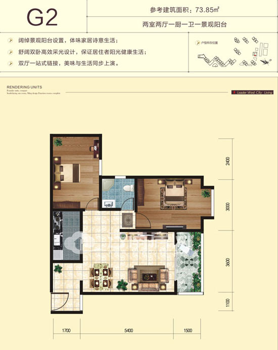 G2戶型建筑面積為73.85平米,戶型設(shè)計(jì)為二室兩廳一廚一衛(wèi)一景觀陽(yáng)臺(tái)。該戶型是新域盛景少數(shù)沒(méi)有地下贈(zèng)送空間的戶型。