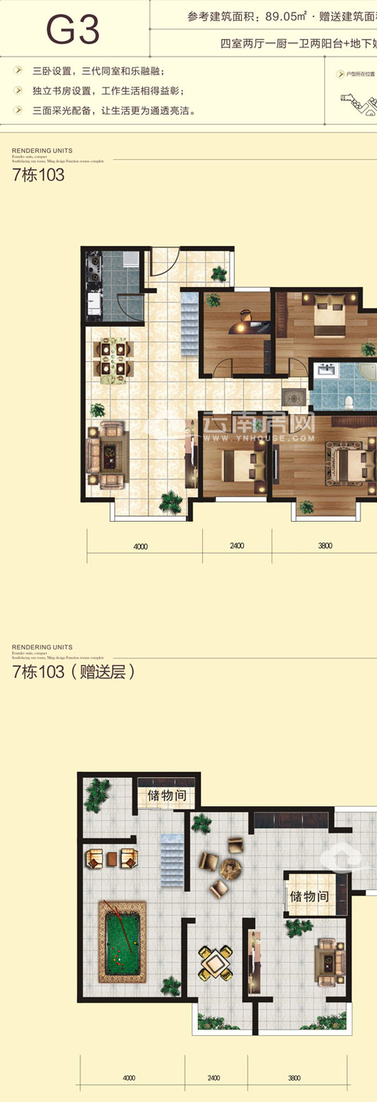 G3戶型建筑面積雖然只有89.05平米,但是贈(zèng)送的建筑面積高達(dá)70多平米,如此,該戶型便可升級(jí)為四室兩廳一廚一衛(wèi)兩陽(yáng)臺(tái)+地下娛樂(lè)室的設(shè)計(jì)。