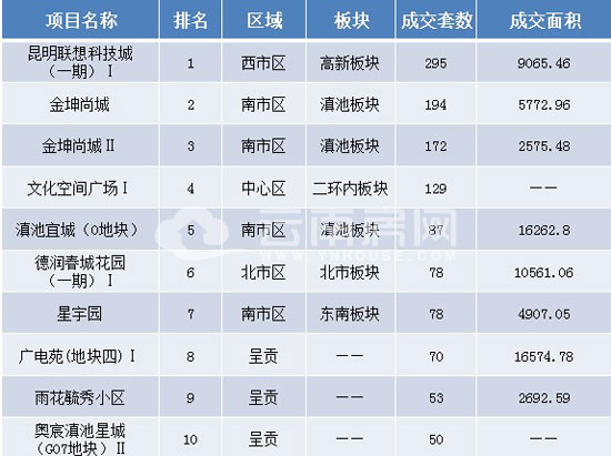 本周備案前三強分別位于西市區(qū)與南市區(qū),排名先后順序為:昆明聯(lián)想科技城(一期)Ⅰ、金坤尚城和金坤尚城Ⅱ。注:由于備案系統(tǒng)公布數(shù)據(jù)局限,top10排名僅做參考。