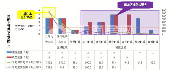 主城二環(huán)內(nèi)板塊和東市板塊各有4塊土地供應(yīng),呈貢1塊土地供應(yīng),均全部成交;輔城地宗集中于晉寧、祿勸區(qū)域,成交集中在晉寧和宜良區(qū)域;