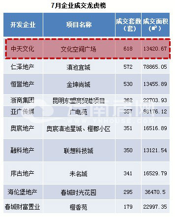 文化空間廣場(chǎng)Ⅰ以618套銷售量成為7月樓盤銷冠;中天文化憑借文化空間廣場(chǎng)以618套銷售量成為本月企業(yè)售冠。