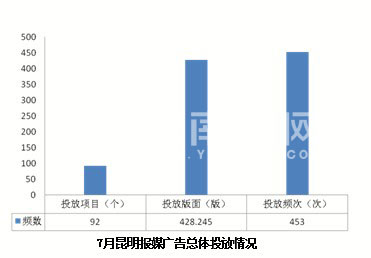 7月昆明房地產(chǎn)廣告媒體投放項(xiàng)目共計(jì)92個(gè),投放版面428.245版,共計(jì)投放453次,較6月放量明顯增強(qiáng)。