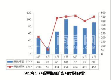 從2013年1-7月昆明平面媒體月度投放情況來(lái)看,自3月后媒體投放總體保持平穩(wěn)中震蕩前行,項(xiàng)目投放波動(dòng)較明顯。