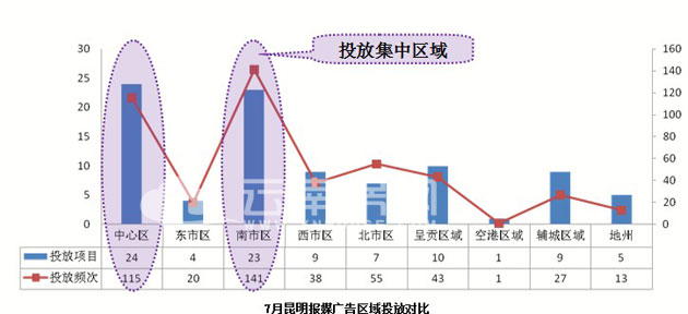 中、南領(lǐng)銜:從7月昆明媒體廣告區(qū)域投放情況來(lái)看,南市區(qū)和中心區(qū)的投放量最集中。其中中心區(qū)樓盤(pán)投放量?jī)H高出南市區(qū)1個(gè)項(xiàng)目,項(xiàng)目投放占比分別為26.09%和25%;而南市區(qū)的報(bào)媒投放頻次遠(yuǎn)高出中心區(qū)26次,投放頻次占比分別為25.39%和31.13%。