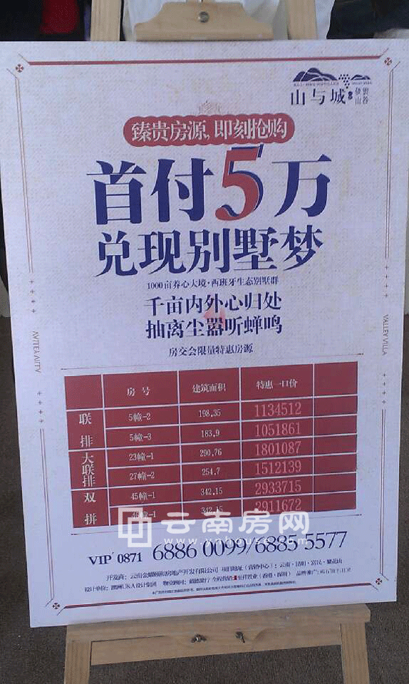 據(jù)云南房網(wǎng)小編在房交會現(xiàn)場了解,山與城于4月10日-14日,項目現(xiàn)場共推出6套特價房,分別為兩套聯(lián)排,兩套大聯(lián)排,兩套雙拼別墅,可享受88折優(yōu)惠?們r從105萬-293萬之間。項目春交會1號館展出。另外目前項目還在做團(tuán)購活動,最高優(yōu)惠10個點。