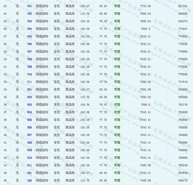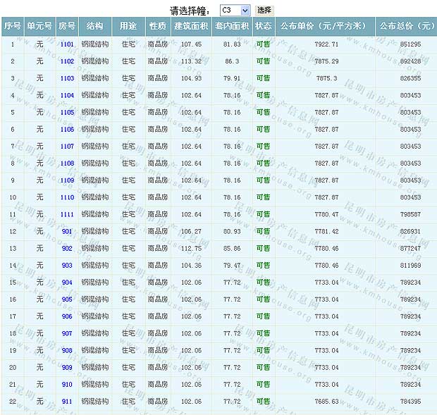 根據云南省物價局關于發(fā)布《云南省商品房銷售明碼標價實施細則(試行)》的通知,現(xiàn)將該項目商品住房的準售房源及每套房屋價格向社會公布,房地產開發(fā)企業(yè)應嚴格按照公布價格,商品房銷售明碼標價實行一套一標。商品房經營者應當對每套商品房按照建筑面具進行明碼標價,否則,房產登記機關不予登記備案。準售房源及房價信息如下: