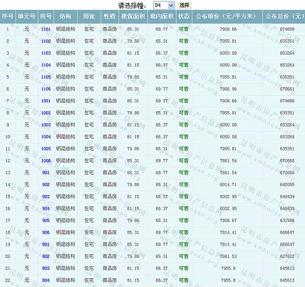 根據云南省物價局關于發(fā)布《云南省商品房銷售明碼標價實施細則(試行)》的通知,現將該項目商品住房的準售房源及每套房屋價格向社會公布,房地產開發(fā)企業(yè)應嚴格按照公布價格,商品房銷售明碼標價實行一套一標。商品房經營者應當對每套商品房按照建筑面具進行明碼標價,否則,房產登記機關不予登記備案。準售房源及房價信息如下: