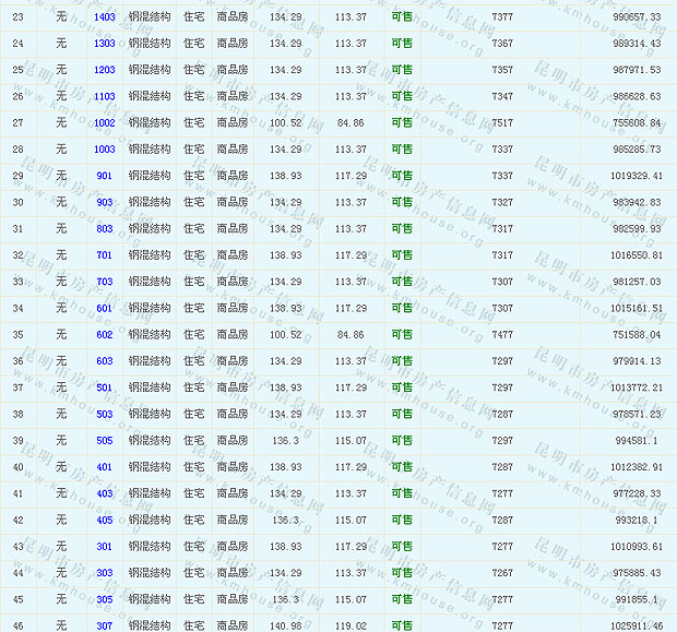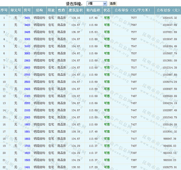 根據(jù)云南省物價(jià)局關(guān)于發(fā)布《云南省商品房銷售明碼標(biāo)價(jià)實(shí)施細(xì)則(試行)》的通知,現(xiàn)將該項(xiàng)目商品住房的準(zhǔn)售房源及每套房屋價(jià)格向社會(huì)公布,房地產(chǎn)開發(fā)企業(yè)應(yīng)嚴(yán)格按照公布價(jià)格,商品房銷售明碼標(biāo)價(jià)實(shí)行一套一標(biāo)。商品房經(jīng)營(yíng)者應(yīng)當(dāng)對(duì)每套商品房按照建筑面具進(jìn)行明碼標(biāo)價(jià),否則,房產(chǎn)登記機(jī)關(guān)不予登記備案。準(zhǔn)售房源及房?jī)r(jià)信息如下: