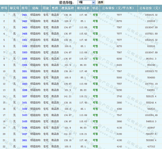 根據(jù)云南省物價(jià)局關(guān)于發(fā)布《云南省商品房銷售明碼標(biāo)價(jià)實(shí)施細(xì)則(試行)》的通知,現(xiàn)將該項(xiàng)目商品住房的準(zhǔn)售房源及每套房屋價(jià)格向社會(huì)公布,房地產(chǎn)開發(fā)企業(yè)應(yīng)嚴(yán)格按照公布價(jià)格,商品房銷售明碼標(biāo)價(jià)實(shí)行一套一標(biāo)。商品房經(jīng)營(yíng)者應(yīng)當(dāng)對(duì)每套商品房按照建筑面具進(jìn)行明碼標(biāo)價(jià),否則,房產(chǎn)登記機(jī)關(guān)不予登記備案。準(zhǔn)售房源及房?jī)r(jià)信息如下: