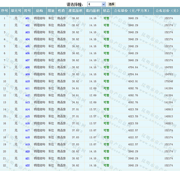 根據(jù)云南省物價局關(guān)于發(fā)布《云南省商品房銷售明碼標價實施細則(試行)》的通知,現(xiàn)將該項目商品住房的準售房源及每套房屋價格向社會公布,房地產(chǎn)開發(fā)企業(yè)應(yīng)嚴格按照公布價格,商品房銷售明碼標價實行一套一標。商品房經(jīng)營者應(yīng)當對每套商品房按照建筑面具進行明碼標價,否則,房產(chǎn)登記機關(guān)不予登記備案。準售房源及房價信息如下: