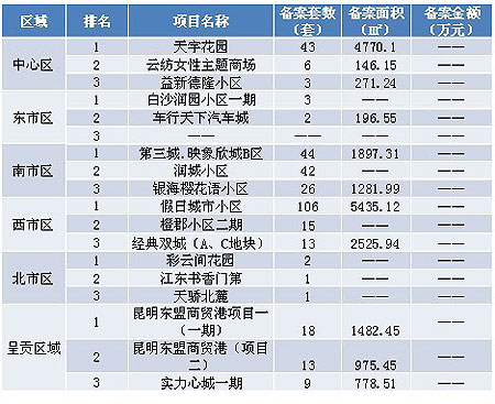 本周各區(qū)域房地產(chǎn)市場交易套數(shù)三強(qiáng):本周備案前三強(qiáng)分別位于西市區(qū)、南市區(qū)與中心區(qū),排名先后順序為:假日城市小區(qū)、第三城.映象欣城B區(qū)以及天宇花園。注:由于備案系統(tǒng)未公布成交金額,故備案金額暫時空白。