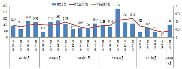本周昆明商品房共備案1410套,環(huán)比增長3710.81%。備案套數(shù)大幅增長的主要是由春節(jié)前開盤項目建工新城商業(yè)中心與春城慧谷小區(qū)一期近期集中備案,且上周春節(jié)期間備案較少所致。備案系統(tǒng)未公布成交價格,故成交均價無法確定。