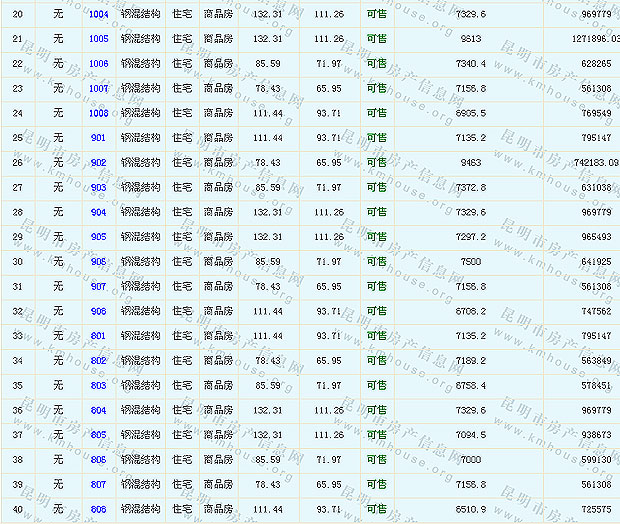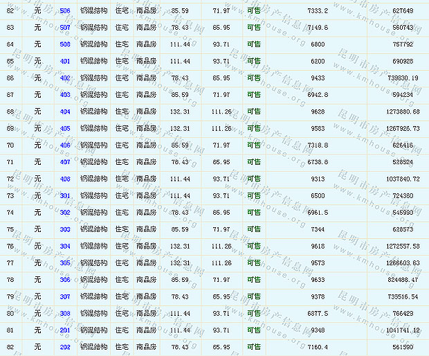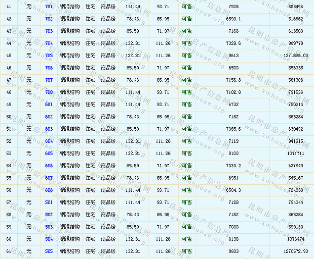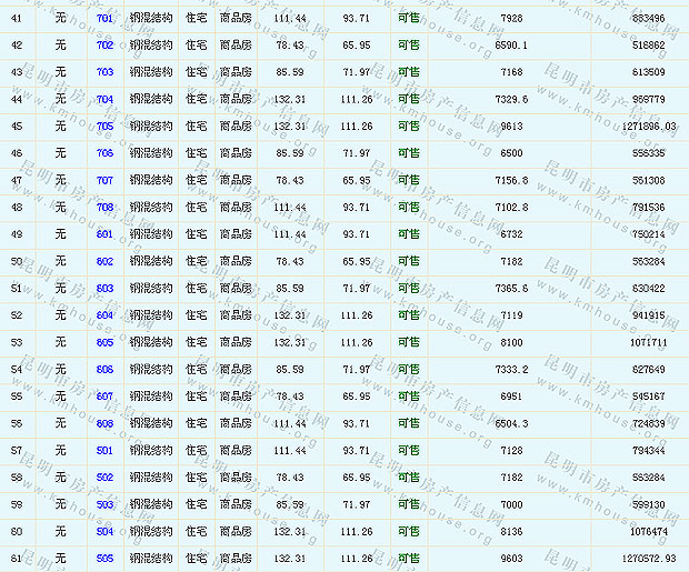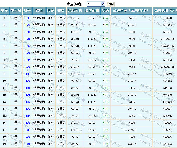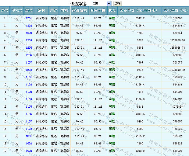 根據(jù)云南省物價局關(guān)于發(fā)布《云南省商品房銷售明碼標(biāo)價實(shí)施細(xì)則(試行)》的通知,現(xiàn)將該項(xiàng)目商品住房的準(zhǔn)售房源及每套房屋價格向社會公布,房地產(chǎn)開發(fā)企業(yè)應(yīng)嚴(yán)格按照公布價格,商品房銷售明碼標(biāo)價實(shí)行一套一標(biāo)。商品房經(jīng)營者應(yīng)當(dāng)對每套商品房按照建筑面具進(jìn)行明碼標(biāo)價,否則,房產(chǎn)登記機(jī)關(guān)不予登記備案。準(zhǔn)售房源及房價信息如下: