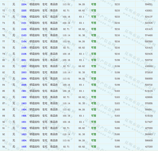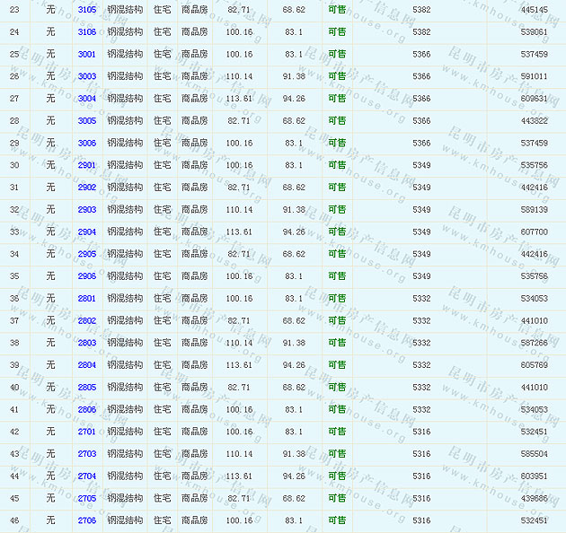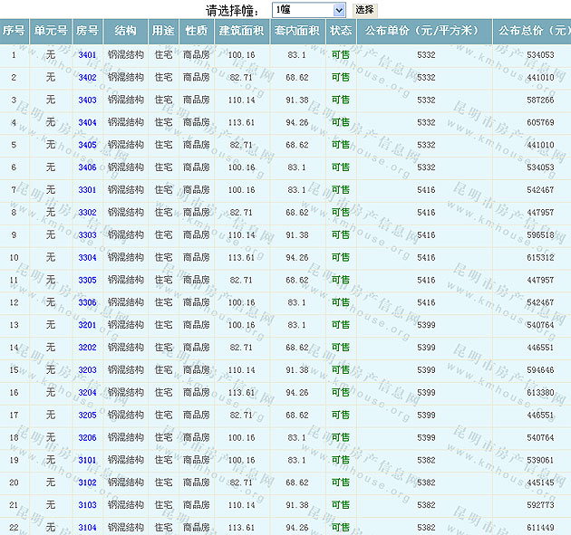 根據(jù)云南省物價局關于發(fā)布《云南省商品房銷售明碼標價實施細則(試行)》的通知,現(xiàn)將該項目商品住房的準售房源及每套房屋價格向社會公布,房地產開發(fā)企業(yè)應嚴格按照公布價格,商品房銷售明碼標價實行一套一標。商品房經營者應當對每套商品房按照建筑面具進行明碼標價,否則,房產登記機關不予登記備案。準售房源及房價信息如下: