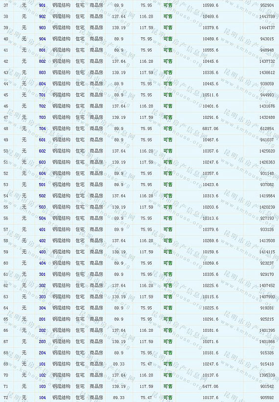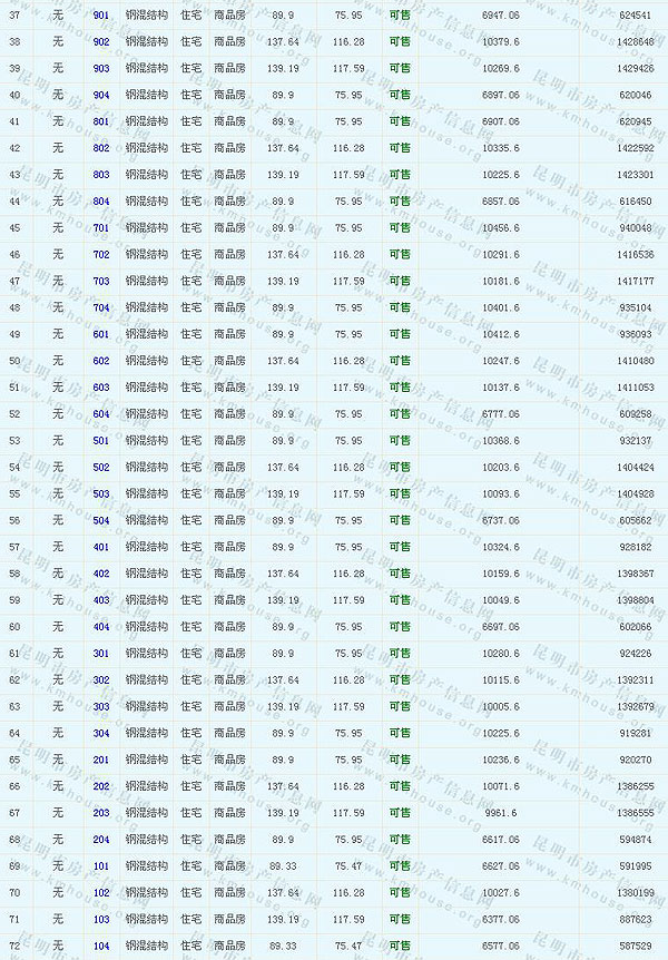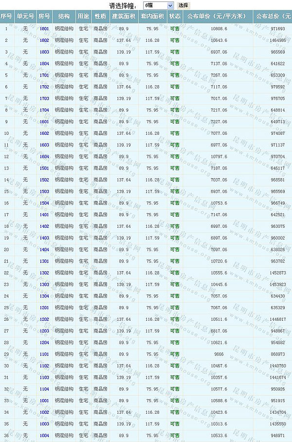 根據(jù)云南省物價(jià)局關(guān)于發(fā)布《云南省商品房銷(xiāo)售明碼標(biāo)價(jià)實(shí)施細(xì)則(試行)》的通知,現(xiàn)將該項(xiàng)目商品住房的準(zhǔn)售房源及每套房屋價(jià)格向社會(huì)公布,房地產(chǎn)開(kāi)發(fā)企業(yè)應(yīng)嚴(yán)格按照公布價(jià)格,商品房銷(xiāo)售明碼標(biāo)價(jià)實(shí)行一套一標(biāo)。商品房經(jīng)營(yíng)者應(yīng)當(dāng)對(duì)每套商品房按照建筑面具進(jìn)行明碼標(biāo)價(jià),否則,房產(chǎn)登記機(jī)關(guān)不予登記備案。準(zhǔn)售房源及房?jī)r(jià)信息如下: