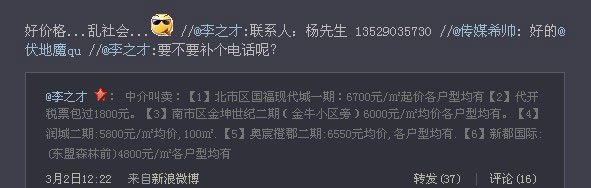 此外,由榮城地產(chǎn)分銷的欣都龍城是8000元左右的均價,轉(zhuǎn)讓費3.2萬,戶型面積僅有60平米的了,目前僅剩7、8套房源了。而未開盤就團購轉(zhuǎn)讓的房源也有很多,如微博上@李之才發(fā)表中介叫賣一手樓盤創(chuàng)收益的信息:“【1】北市區(qū)國,F(xiàn)代城一期:6700元/㎡起價各戶型均有【2】代開稅票包過1800元。【3】南市區(qū)金坤世紀二期(金牛小區(qū)旁)6000元/㎡均價各戶型均有!4】潤城二期:5800元/㎡均價,100㎡.【5】奧宸橙郡二期:6550元均價,各戶型均有.【6】新都國際:(東盟森林前)4800元/㎡各戶型均有,聯(lián)系人楊先生13529035730”。