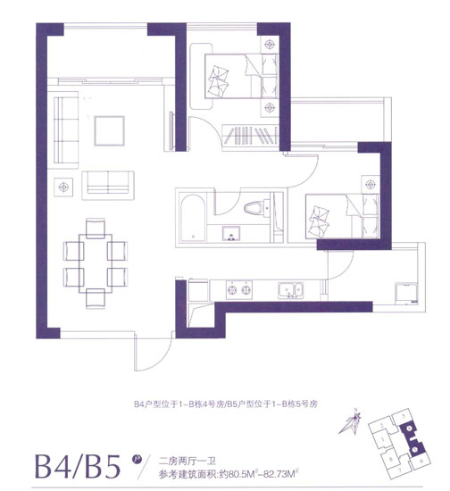 80.54平米——82.73平米的B4、B5戶型為兩室兩廳一衛(wèi)的設計,東南朝向,適合新婚夫妻,此戶型分布在1-B棟的4、5號房,戶型空間分布合理:入戶就是緊密相連的餐廳與客廳,客廳還連接一個大的生活陽臺,進門的右側即是廚房及陽臺外可晾曬衣物的小生活陽臺,整個戶型的設計動靜分離,空間利用很緊湊。缺點在于主臥與次臥之間的生活陽臺有些別扭,裝修時可以改為衣帽間或者小書房或許會稍好些,且衛(wèi)生間在整個房子的中央位置,無通風窗戶,既影響美觀也不利于人體健康。