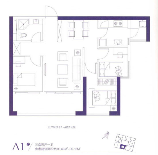 88.63平米——90.16平米的A1戶型位于1-A棟1號房,為三室兩廳一衛(wèi)設計,南偏西朝向(可算作南向房)。整體來看戶型方正,但戶型功能區(qū)較為混亂,進右側為衛(wèi)生間,左側為餐廳,餐廳的左側為廚房,按樓書上的圖示區(qū)分,還需在餐廳位置設置屏風,很不符合人們?nèi)粘>幼〉牧晳T和要求,主臥與次臥之間有狹長過道,造成空間浪費,也不好擺設物品。不過書房與客廳外通暢的大陽臺很愜意,可以擺放花草,也可設計成主人的茶室。