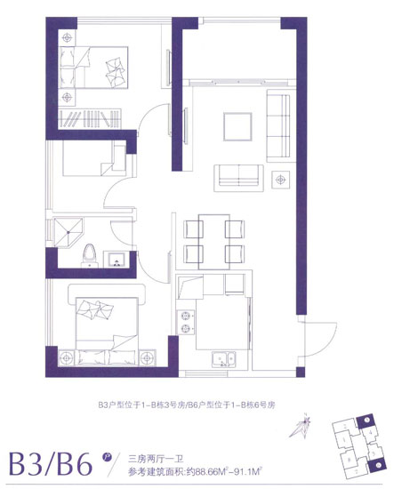 88.66平米——91.1平米的戶型為三室兩廳一衛(wèi),為B3、B6戶型分別位于1-B棟3號(hào)房和1-B棟6號(hào)房,均為東南朝向,適合三口之家。此戶型較為方正,進(jìn)門即是廚房,需要經(jīng)過(guò)一個(gè)過(guò)道才能到達(dá)餐廳與客廳,雖然客廳與大生活陽(yáng)臺(tái)連接,但空氣對(duì)流不暢,且餐廳的采光不足。主臥、側(cè)臥、書房、衛(wèi)生間在同一平面內(nèi),并且各個(gè)房間的門基本集中于餐廳與客廳的交匯處,雖然避免了空間的浪費(fèi),但給人視覺(jué)上帶來(lái)不舒服感。