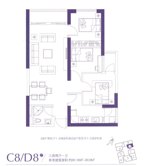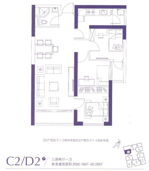 90.16平米——92.28平米的C2、D2戶型與90.16平米——90.8平米的C8、D8戶型功能設(shè)計(jì)一致,均為三室兩廳一衛(wèi)的戶型,只不過(guò)方向相反。C2、D2戶型分別位于1-D棟6號(hào)房和1-C棟6號(hào)房,為西南朝向;而C8、D8戶型分別位于1-D棟9號(hào)房和1-C棟9號(hào)房,為東南向。兩個(gè)戶型進(jìn)門的位置都有采光的衛(wèi)生間以及與之錯(cuò)位的廚房門,對(duì)人體健康不利?蛷d與餐廳緊密相連并連接著大生活陽(yáng)臺(tái),可以入戶門外的空氣對(duì)流,美中不足的是主臥需從客廳的南側(cè)開門,大大削弱了客廳的功能,加之書房無(wú)窗戶需從次臥的陽(yáng)臺(tái)采光。