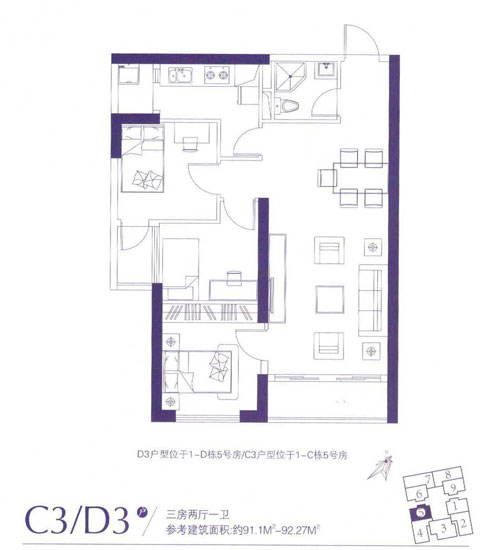 91.1平米——92.27平米的C3、D3戶型與91.1平米——94.59平米的C7、D7戶型功能設(shè)計也一致,均為三室兩廳一衛(wèi)的戶型,方向也是相反的。C3、D3戶型分別為位于1-D棟5號房和1-C棟5號房,為西南朝向;C7、D7戶型分別位于1-D棟1號房和1-C棟1號房,為東南朝向。兩個戶型進門位置都有一個暗衛(wèi),客廳與餐廳、景觀陽臺緊密相連,主臥任是從客廳開門,廚房進門位置有空間浪費,書房也需從次臥采光,次臥與書房間也有小部分的空間浪費。