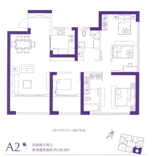 136.9平米的A2戶型為四室兩廳兩衛(wèi)的設計,分布于1-A棟7號房,為東南朝向。此戶型較為方正,有入戶花廳,餐廳與客廳、景觀陽臺自成一體,明廚明衛(wèi)設計,動靜分離,客廳與書房中都帶一個景觀陽臺,適合居住。