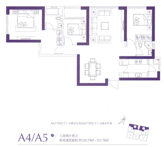 120.79平米——121.76平米A4、A5戶型分布于1-A棟的4號、5號房,為三室兩廳兩衛(wèi)設計,分別為西南和東南朝向。此戶型進門的左側為餐桌,右側為廚房客廳與次臥在同側,公衛(wèi)在房間的東南角,動靜功能區(qū)的區(qū)分明顯,主臥闊綽,明廚明衛(wèi),可以列入參考戶型的范圍。