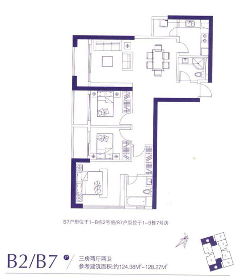 124.38平米——128.27平米的B2、B7戶型為三室兩廳兩衛(wèi),分別位于1-B棟2號和7號房,均為西南朝向。此戶型入戶花廳較長可設計一個玄關,雖也有116.41平米——118.26平米戶型中主臥、次臥、書房間大過道的缺陷,但整體而言,動靜區(qū)分較為明顯,生活、起居獨立分開、互不影響。
