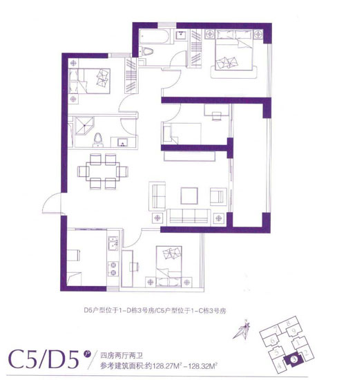 128.27平米——128.32平米的C5、D5戶型分布于1-D棟3號房和1-C棟3號房,為四室兩廳兩衛(wèi)、東南朝向設計。此戶型由于面積大,功能區(qū)的分布易設計,兼具了主臥寬綽、客廳與書房外有連通的超大景觀陽臺、有獨立洗衣房以及空間利用合理的特點,但該戶型同時也有公衛(wèi)無窗戶且在餐廳旁的缺點。