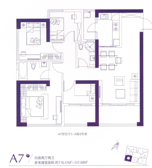 116.41平米——121.58平米的A7戶型位于1-A棟2號房,為四室兩廳兩衛(wèi)、西南朝向設計。此戶型較為方正,戶型設計合理,浪費空間小,動靜區(qū)分明顯,景觀陽臺超大,但公衛(wèi)也無窗戶。