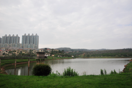 三大內(nèi)湖分別為楓丹湖、鷺棲湖、塞納胡,總面積達20萬㎡,相當(dāng)于整個翠湖的面積。但與翠湖連片分布不同的是,這三個湖泊是呈帶狀環(huán)繞在一排排的小山頭及一二期住宅區(qū)域之間。從項目大門望去,它們猶如敦煌壁畫上飛天舞女的柔軟絲帶。五大園林則以湖、山、林、島、堤為造景要素,融入觀景、休閑、健康、娛樂、交際等不同功能。我們到達項目現(xiàn)場時,一些環(huán)衛(wèi)工人正在對園林中柔軟平整的翠綠草坪做進一步的休整。八大風(fēng)情廣場則依20萬㎡原生湖泊而立,取名為彩蝶花坡、浪琴灣、曉月棧道等,可供業(yè)主散步游玩。
