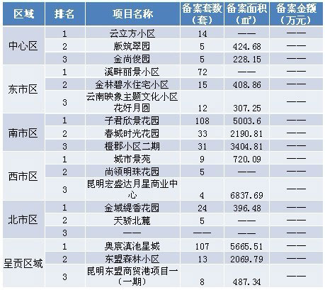 本周備案前三強(qiáng)分別位于南市區(qū)、呈貢與東市區(qū),排名先后順序為:子君欣景花園、奧宸滇池星城以及溪畔麗景小區(qū)。注:由于備案系統(tǒng)未公布成交金額,故備案金額暫時空白。
