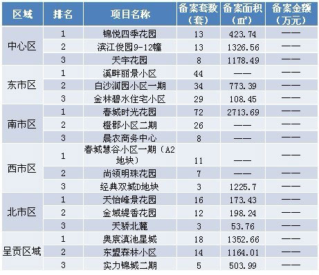 本周各區(qū)域房地產(chǎn)市場交易套數(shù)三強:本周備案前三強分別位于南市區(qū)與東市區(qū),排名先后順序為:春城時光花園、溪畔麗景小區(qū)和白沙潤園小區(qū)一期。注:由于備案系統(tǒng)未公布成交金額,故備案金額暫時空白。