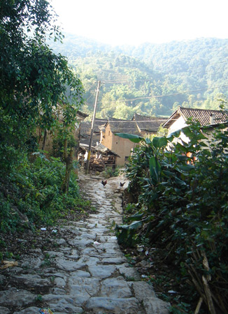 下了車,隨著青石階沿級而上,黑瓦磚房掩映在一片蔥綠之中,溫和的太陽下,鎮(zhèn)上的老人們靠在自家的門口,喝著用超大搪瓷缸子泡的老黃片普洱。站在高處,遠(yuǎn)處山頭一片霧氣茫茫。這樣一種安詳而緩慢的生活使你絕對想不到幾百年前這個(gè)半山坡上的小鎮(zhèn)就是大名鼎鼎的茶馬古道的源頭。