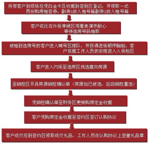 通過觀眾抽號每組7人進(jìn)入選房區(qū)選房,成功后可順便在簽約區(qū)領(lǐng)獎(jiǎng)品。